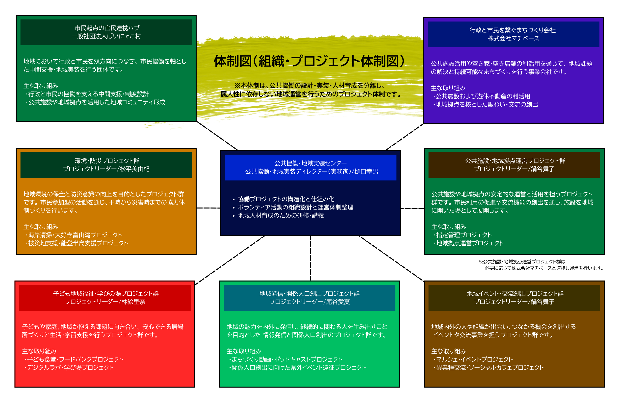 協働、中間支援、関係人口、災害支援、地域教育など5分野のプロジェクトが一つの基盤で連動しています。